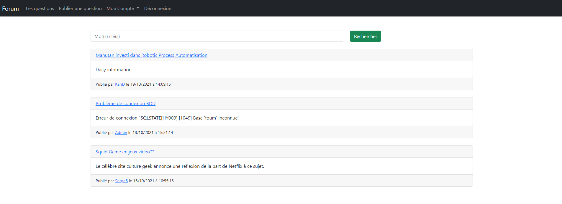 Projet développement de Forum dans le but de maitriser la notion de SESSION, les requêtes SQL, les échanges avec la base de données et le versionning GitHub (utilisation de branche).